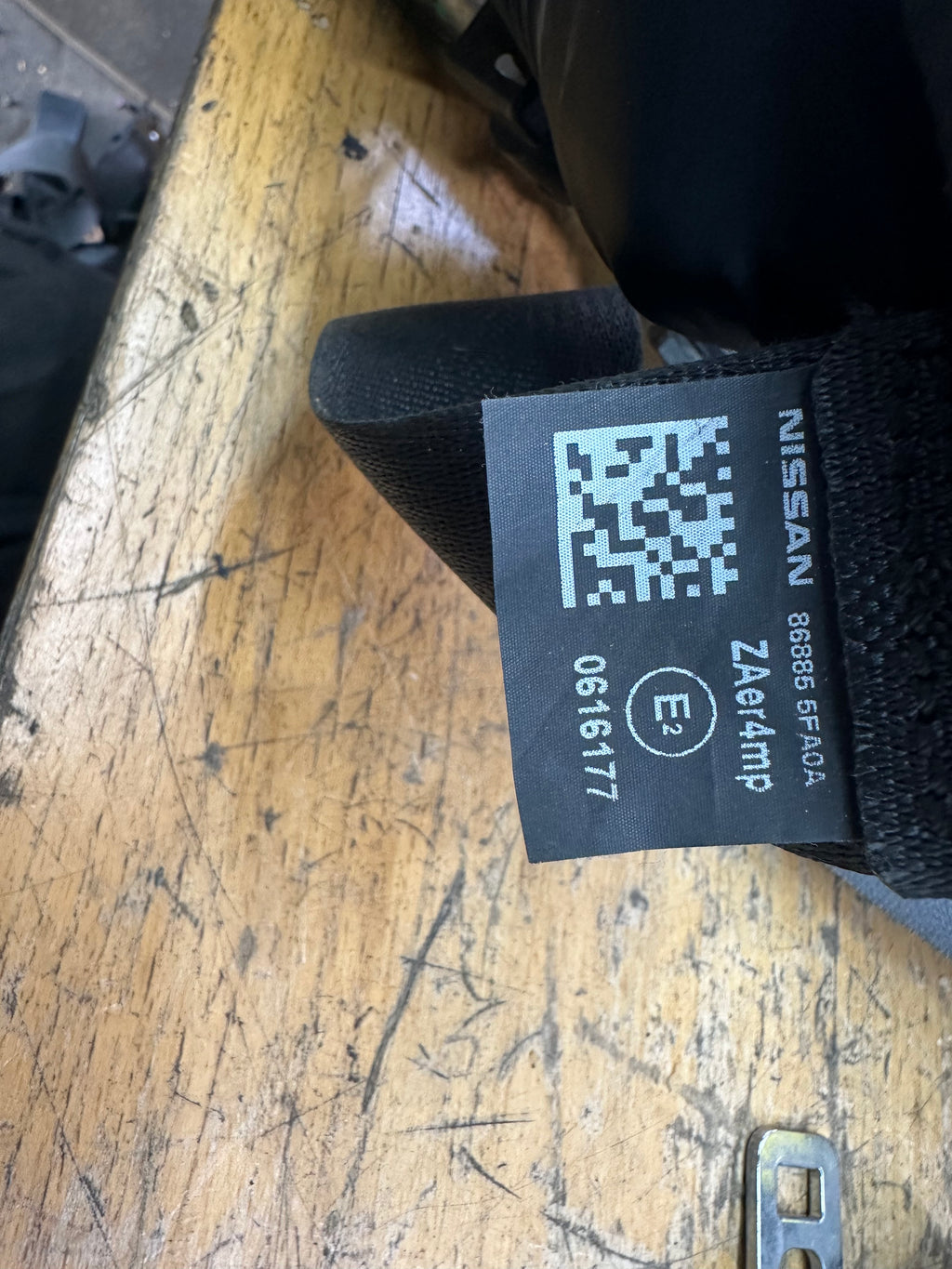 Genuine Nissan front seat belt, removed from a Nissan Micra K14 (2017 model year). This unit fits the front left (NSF – Near Side Front, passenger side) and is a vital component of the vehicle’s original safety restraint system.